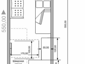 The best choice for such a small room is to buy a half-full bed. If you wish, two people can sleep on it without much damage to comfort, however, buying such a bed will save you 20-40 cm of space. For families with young children, the offer is very important, since the young mother needs space when playing with the child.