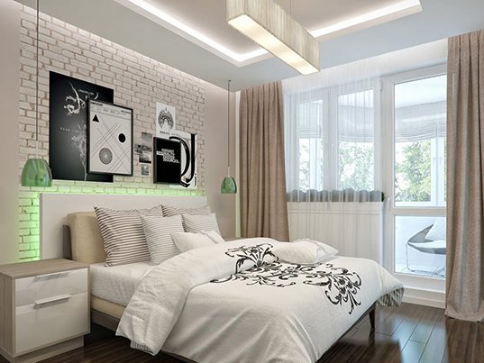 - On the other hand, Hi-tech, Minimalism, Scandinavian styles as nothing else is suitable for the bedroom in the "Khrushchev". Clean lines, glossy surfaces, geometric patterns, pure colors and the almost complete lack of decor are very well suited for creating the illusion of a large bedroom.