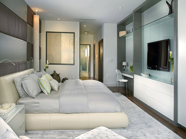 To organize a bedroom of a two-room or three-room apartment, it makes sense to abandon the installation of a closet in the bedroom, but remember that an elongated bedroom can be well balanced by the presence of this object in the far short wall.