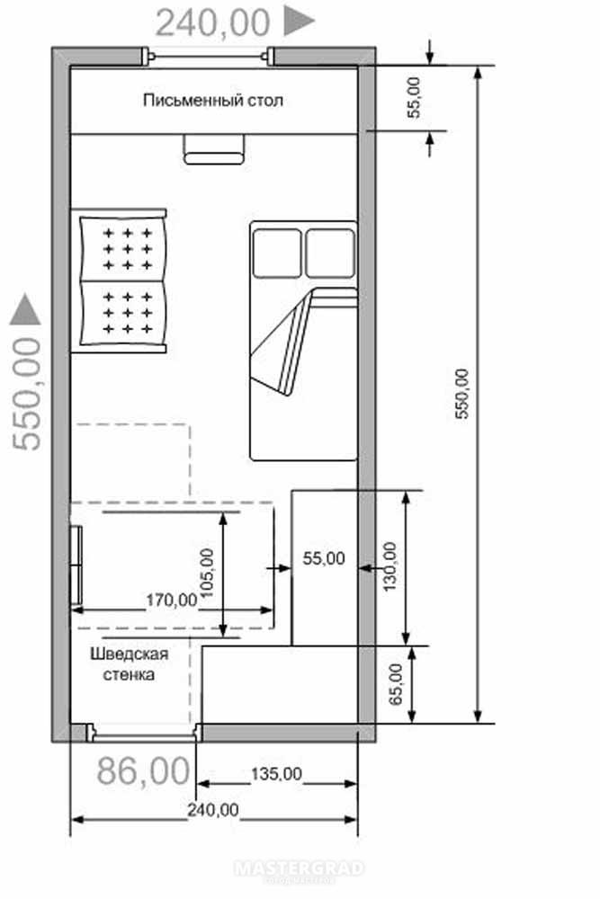 Below are several options for how to arrange the furniture in a narrow bedroom properly. As you can see, there are options with a double bed and a single bed.