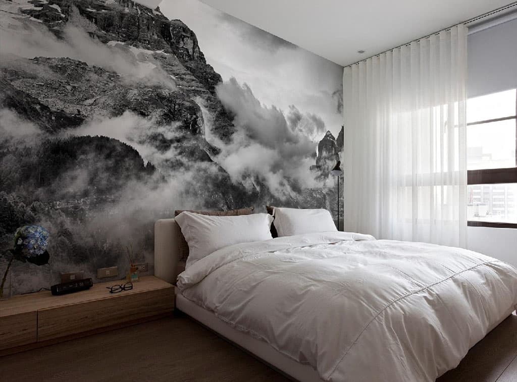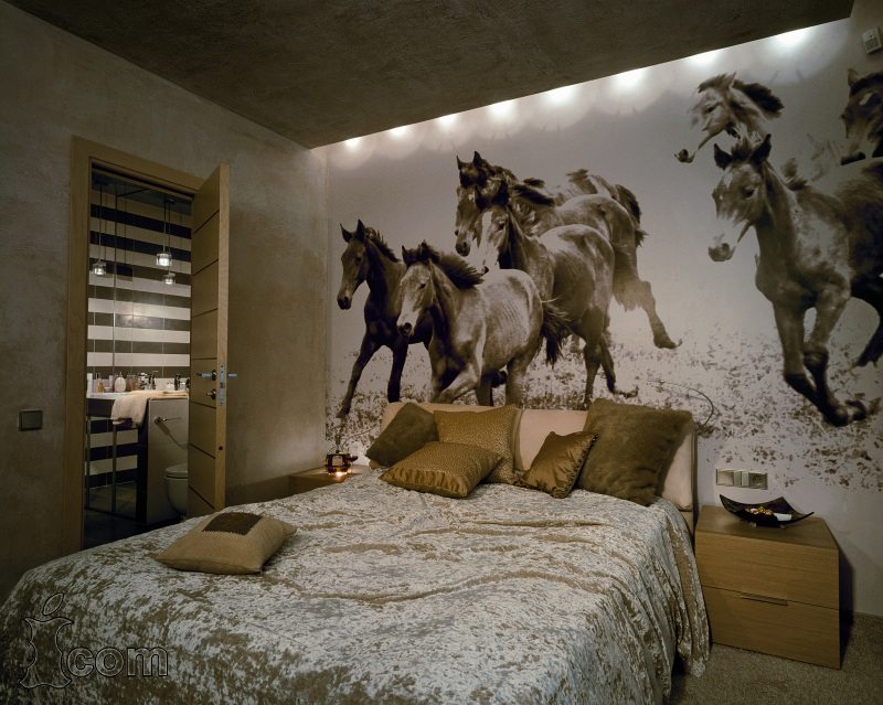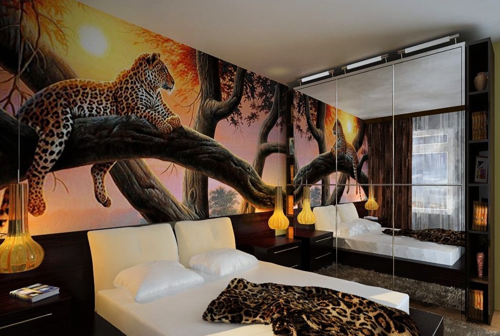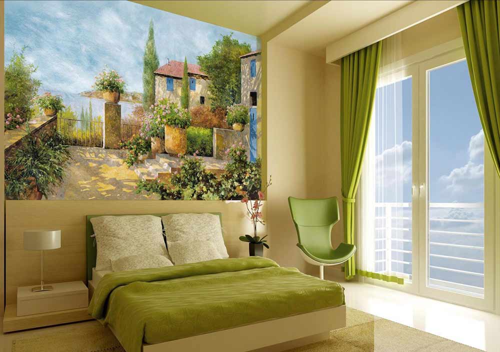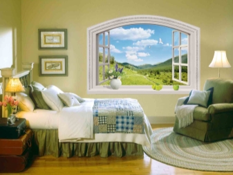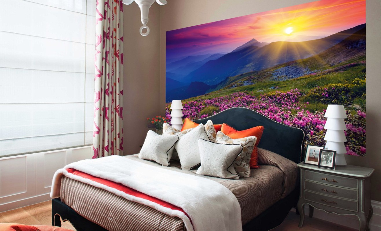 In a small bedroom, you can create the effect of increasing space through a properly selected image. A field or mountain landscape leaving into the distance will add space and air to the room.