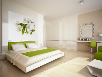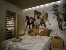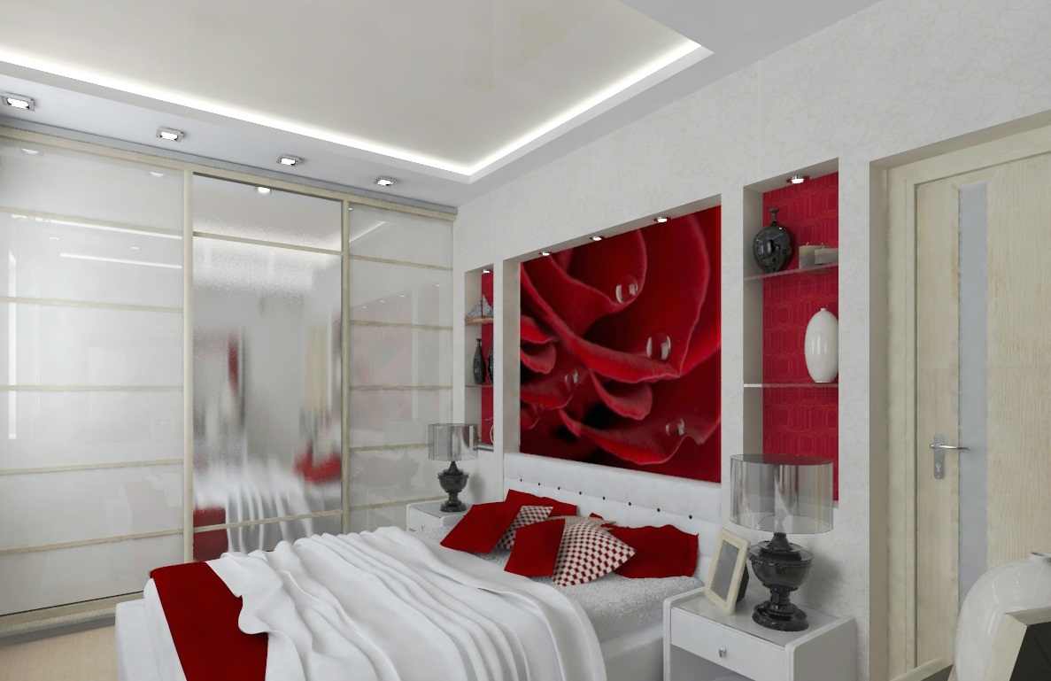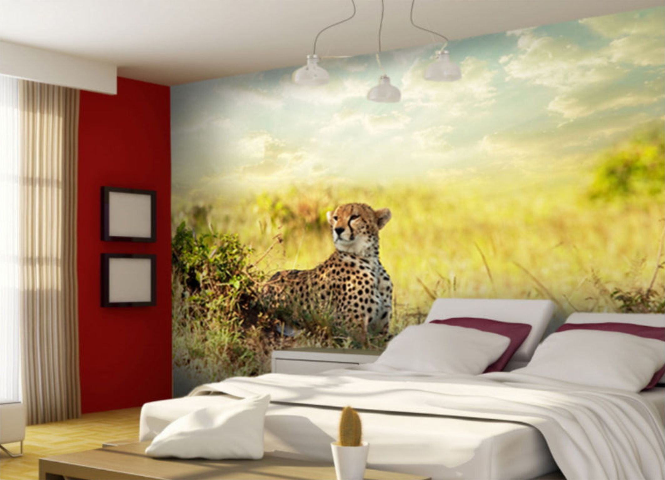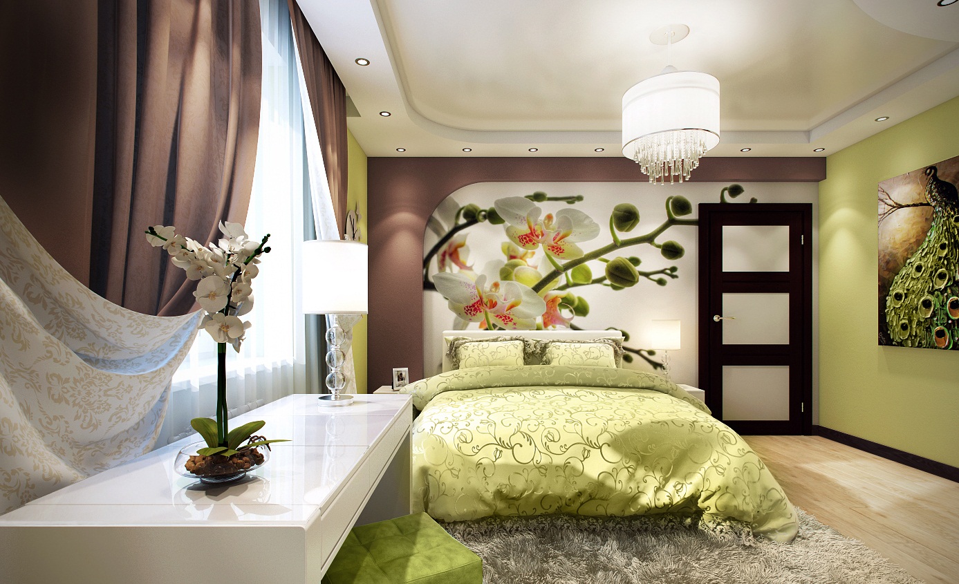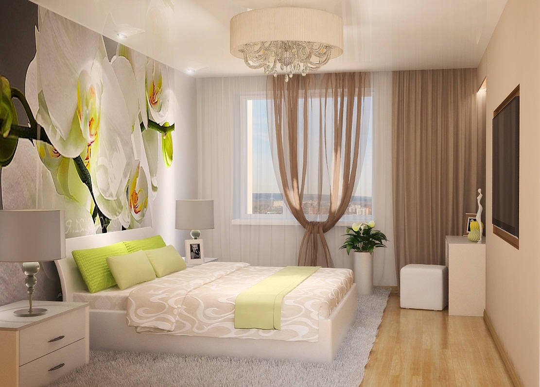 In a small bedroom, you can create the effect of increasing space through a properly selected image. A field or mountain landscape leaving into the distance will add space and air to the room.