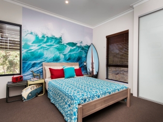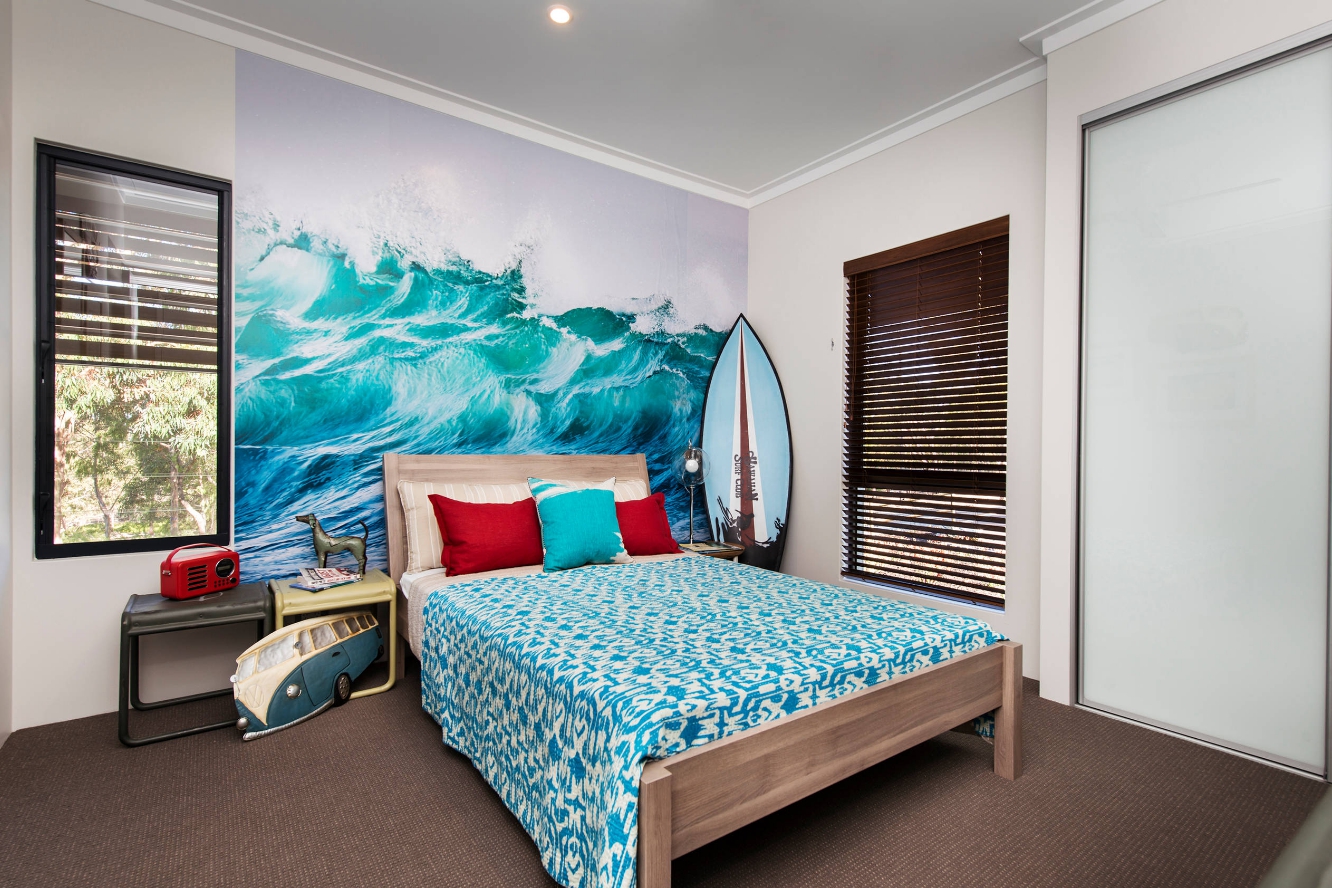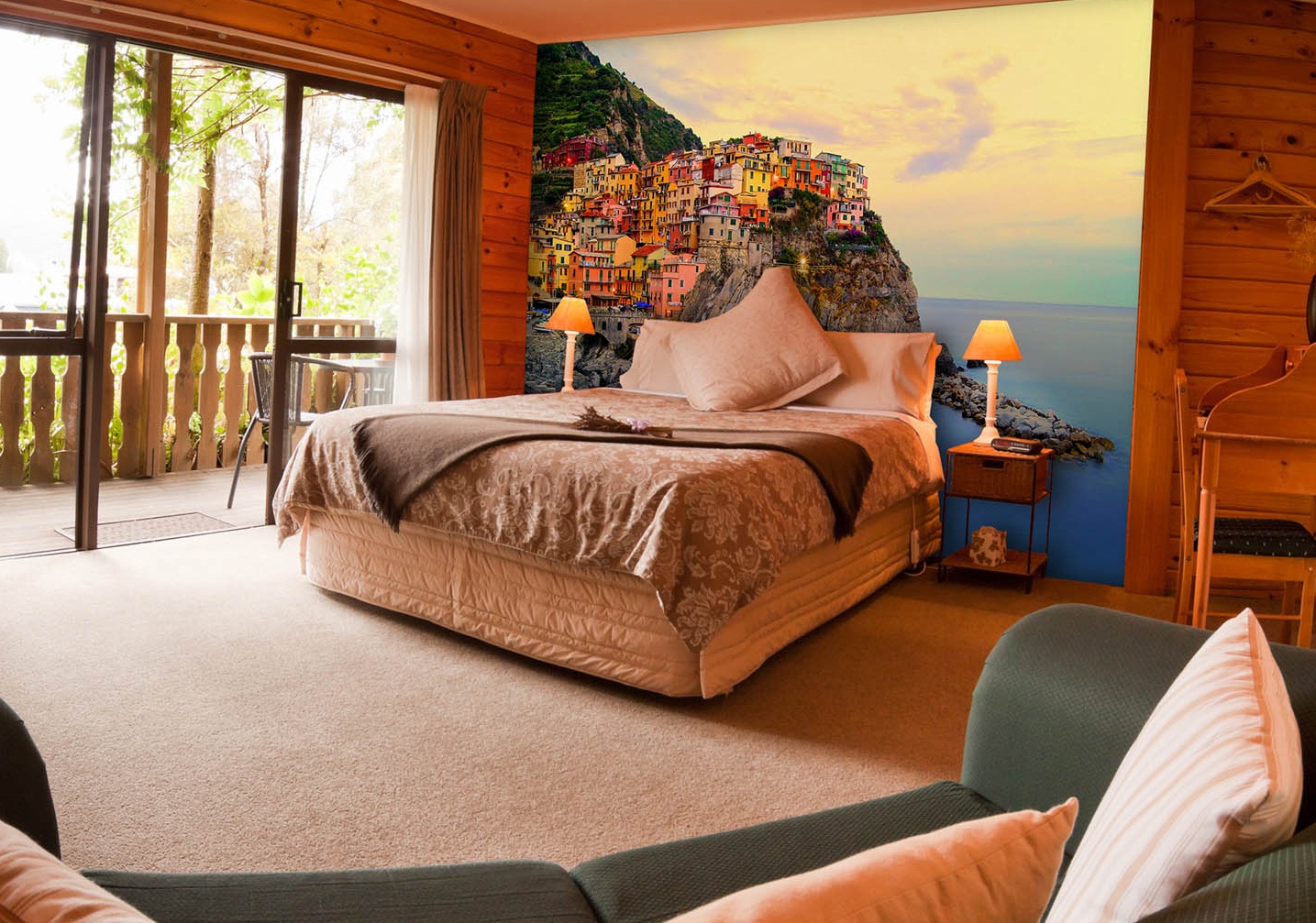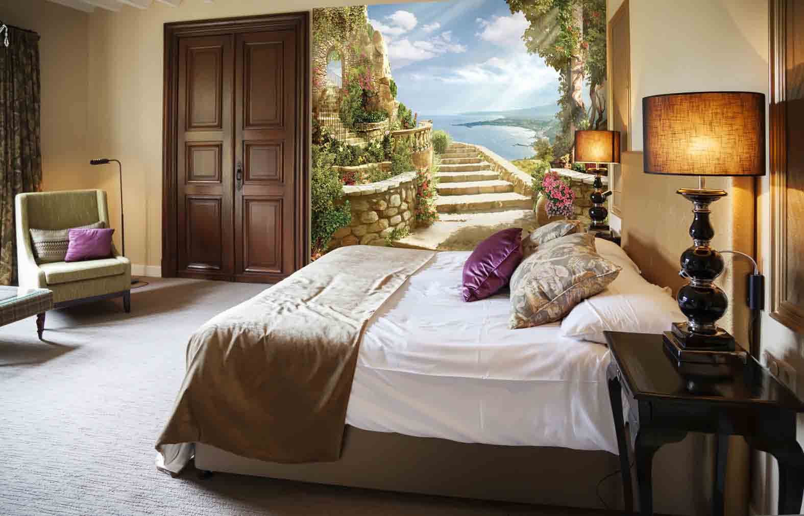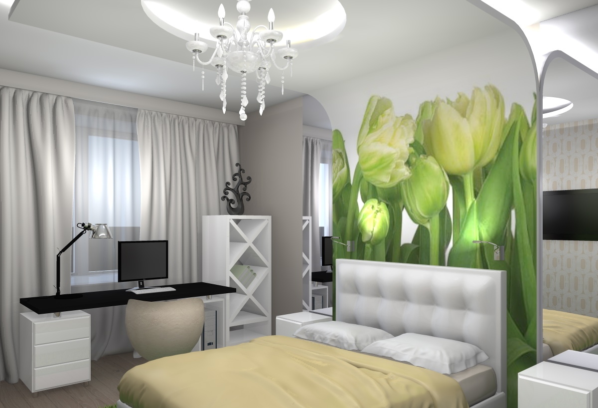 In a small bedroom, you can create the effect of increasing space through a properly selected image. A field or mountain landscape leaving into the distance will add space and air to the room.
