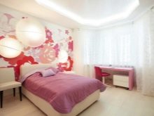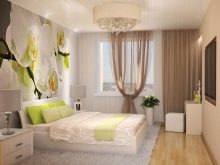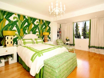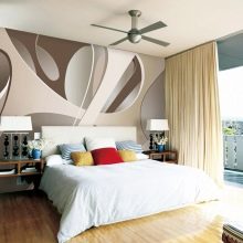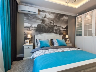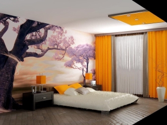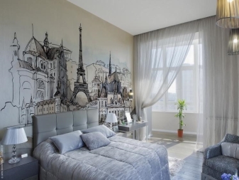 A popular phenomenon today is the compatibility of photo wallpaper and bedroom textiles. Here are the following examples: a bedspread and wallpaper have an identical print, this solution always looks interesting and fresh. In addition, textiles and wallpaper can overlap in the color spectrum, when, for example, plain curtains will match the color of the pattern on the canvas of the wallpaper.