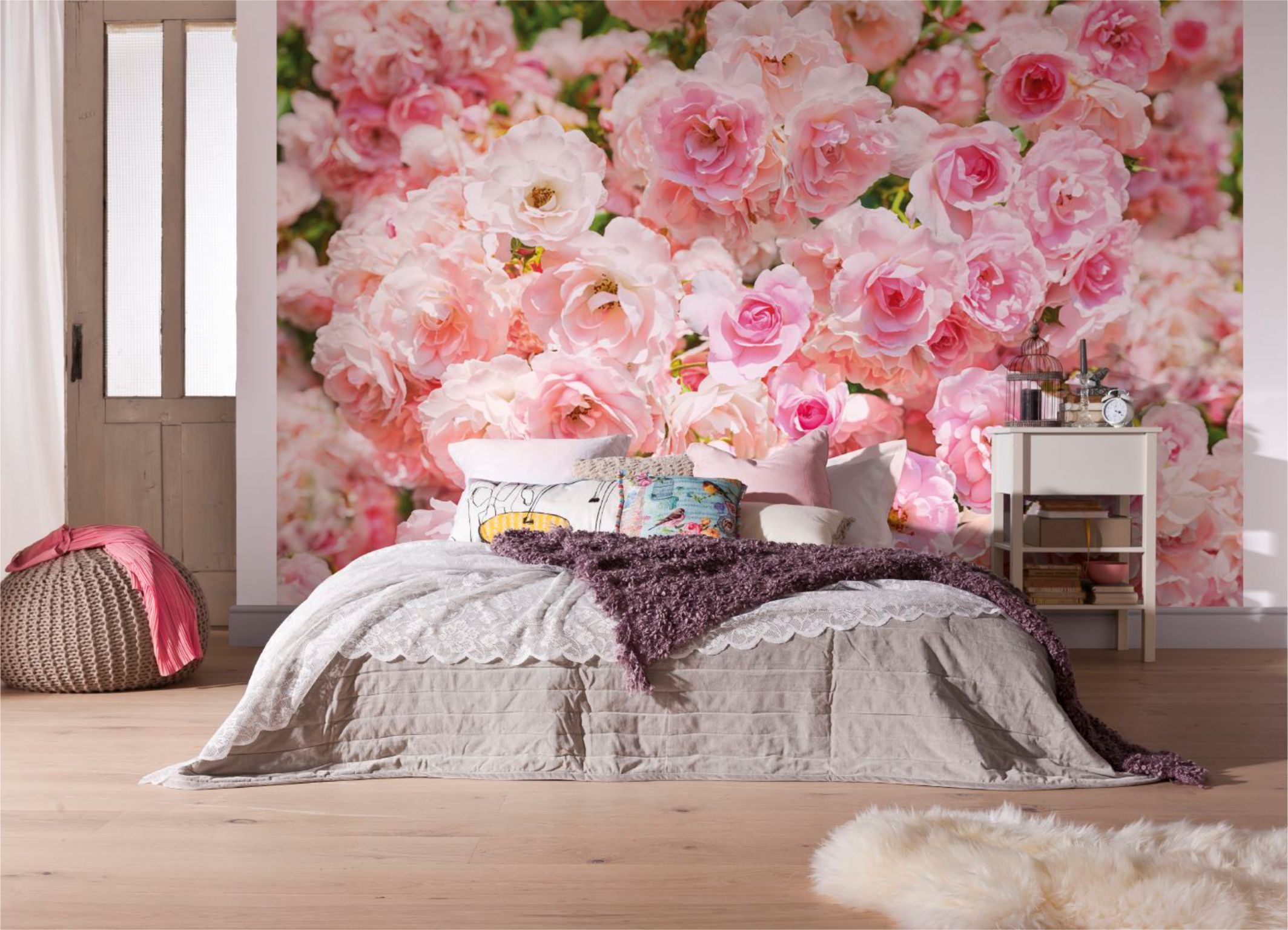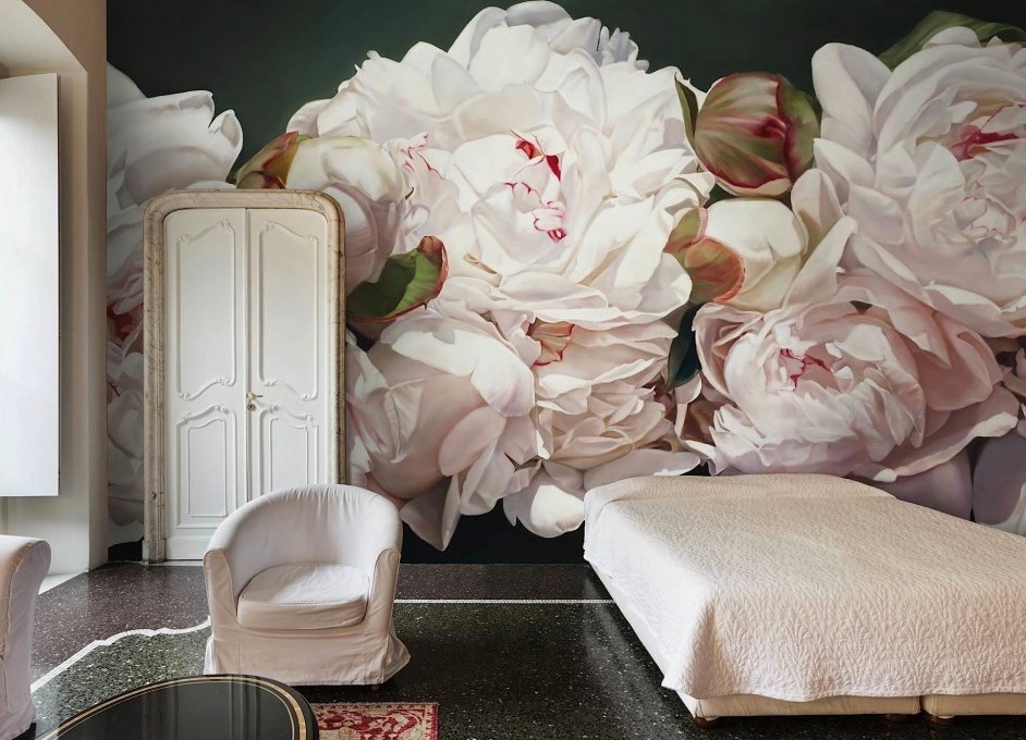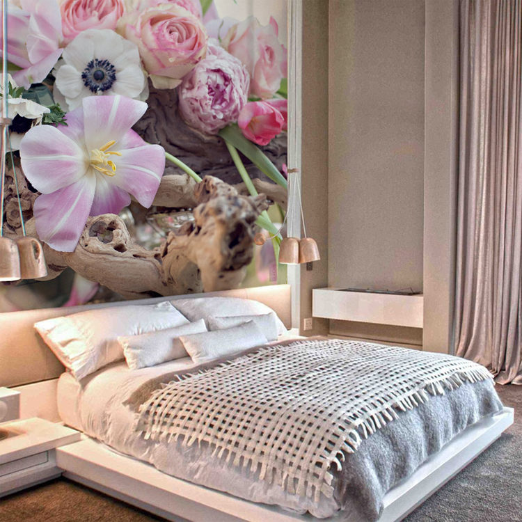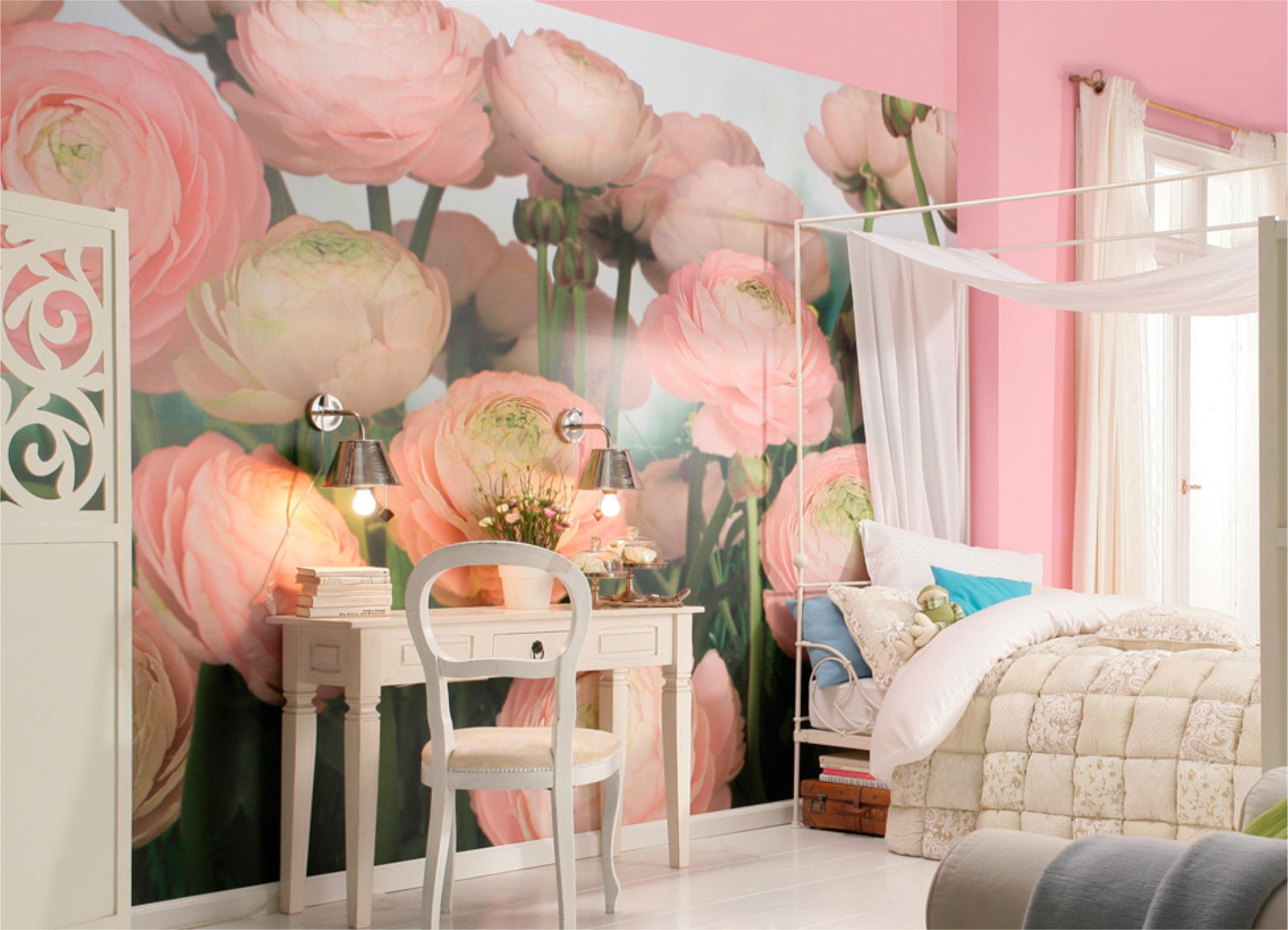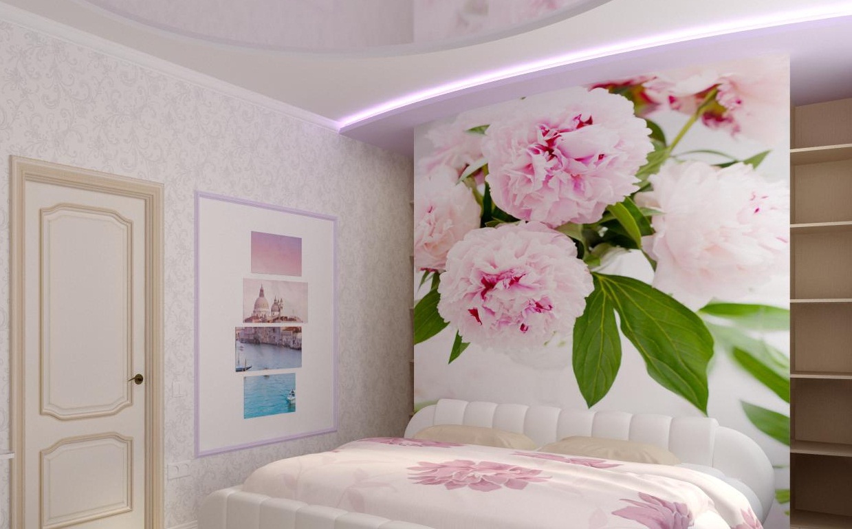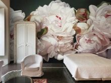 The second most popular after roses today are peonies. These voluminous garden flowers resemble small pink clouds. The use of their image in the interior provides a sense of cheerfulness and tranquility, so their use in the bedroom is justified.
