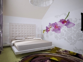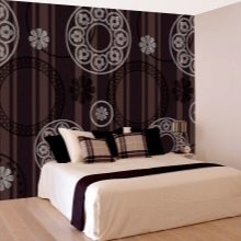 Linking photowall-paper can exist with almost your favorite element of the bedroom. Even with a flower pot on the window, which can be no less spectacular than a combination, for example, with a carpet or rug. By the way, the choice of the same pattern on the bedspread and the photo wallpaper, located at the head, allows you to achieve an interesting effect. So it turns out that the cover and the wallpapers merge into a single texture that passes through the room, starting from the bed and going to the wall, sometimes the same wallpaper is also added to the ceiling, then the decorative line stretches even more and creates the effect of enveloping the space.