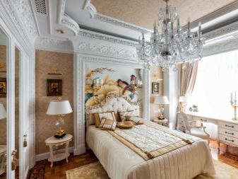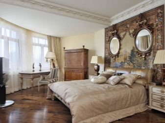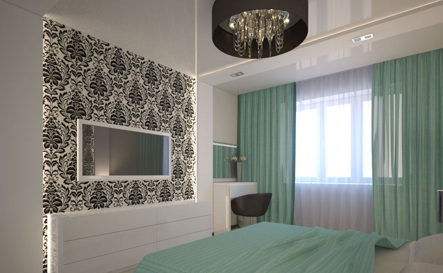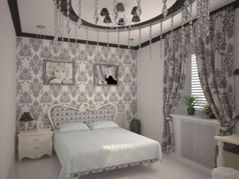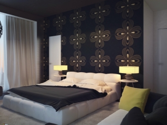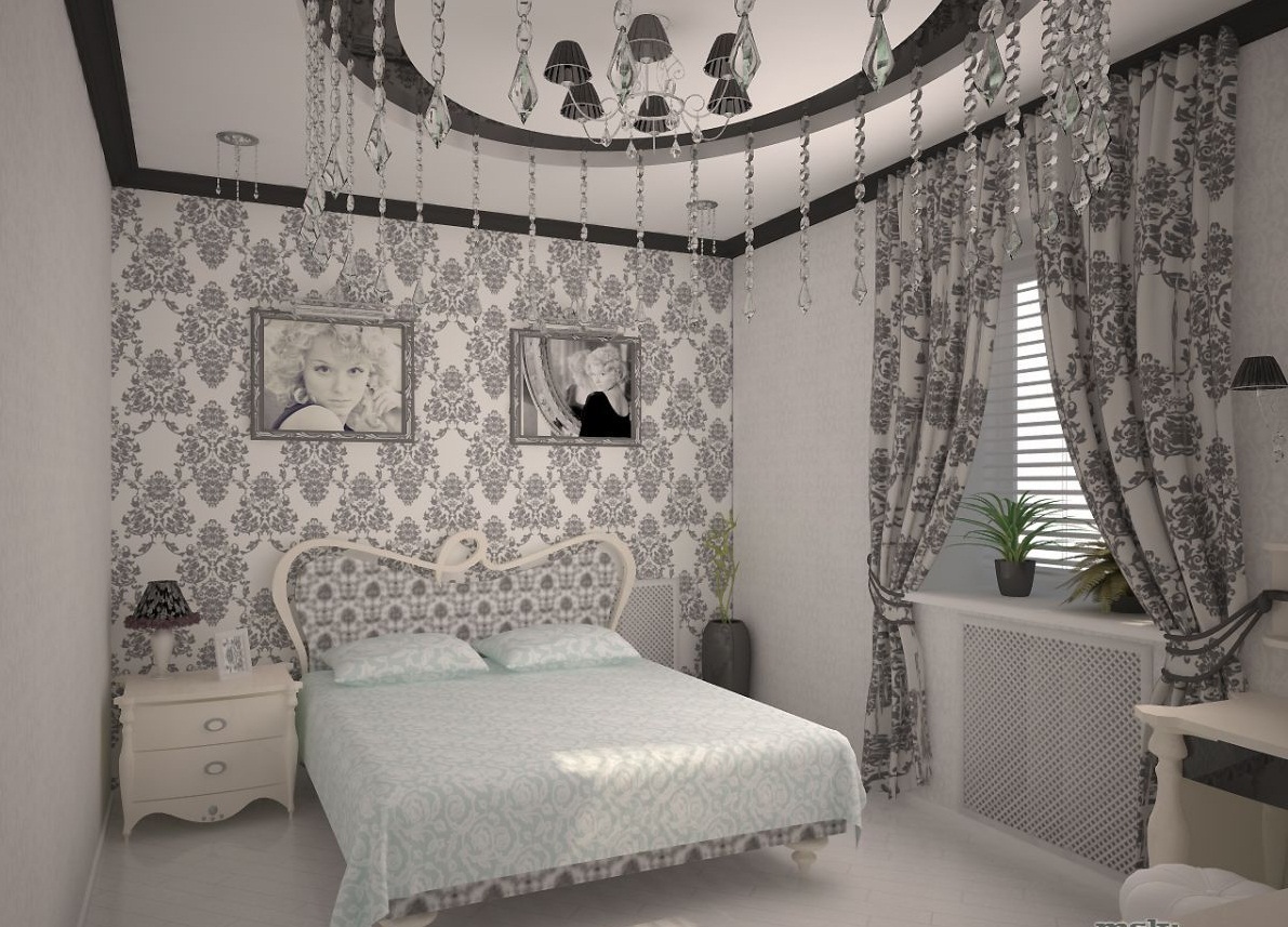 The use of photo wallpapers with monograms will help create a real theater room in the bedroom, and if you choose a burgundy gamut, blue or emerald with gold decorations and at the same time give preference to fabric wallpaper, you can get a real palace.