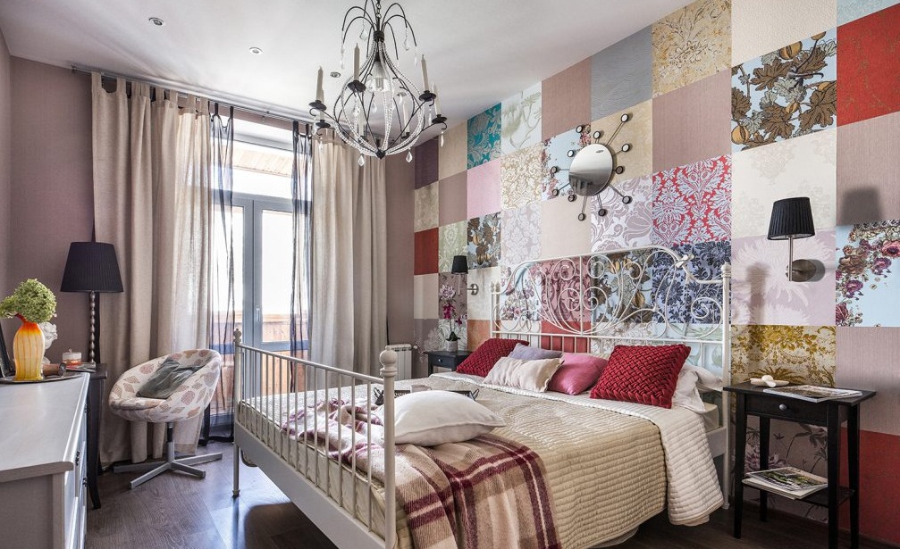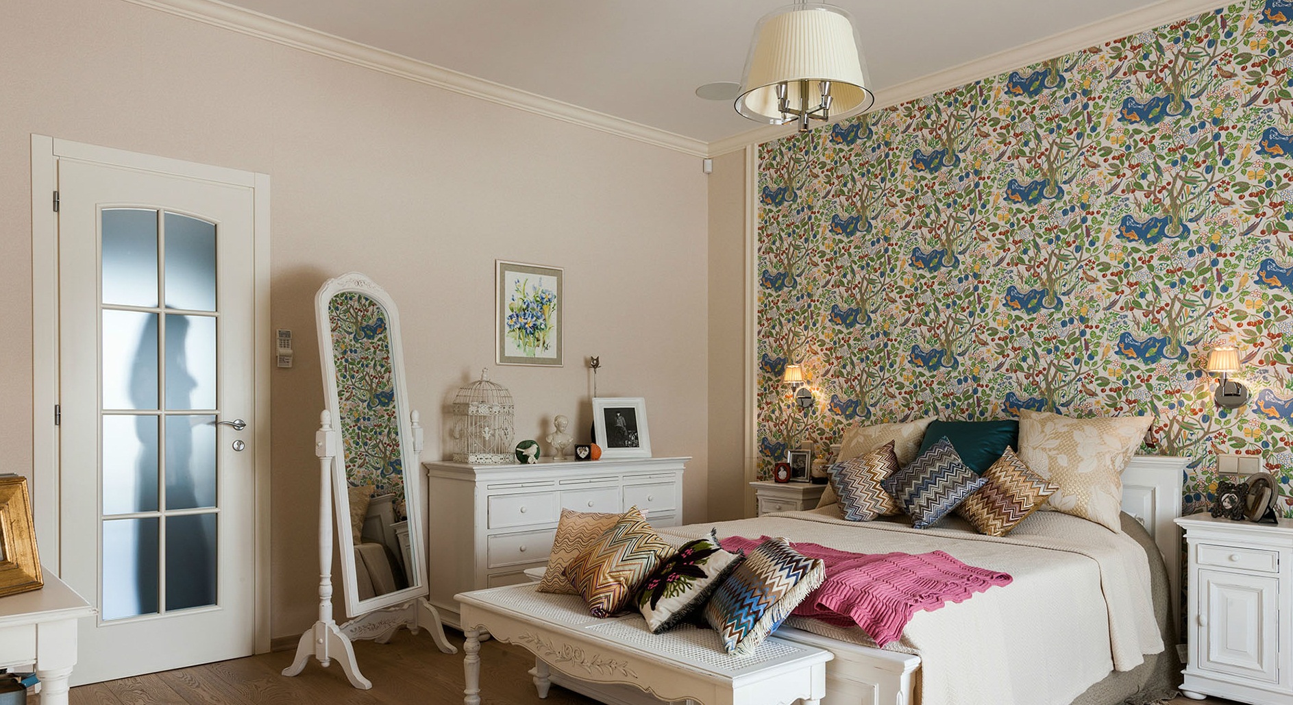 For a bedroom in light colors, wallpapers can act as bright accents. So, for example, you can choose photo wallpapers created on the principle of a collage of several elements and place them opposite the bed in the bedroom, they will become a good accent and diversify the interior, bring a touch of novelty.