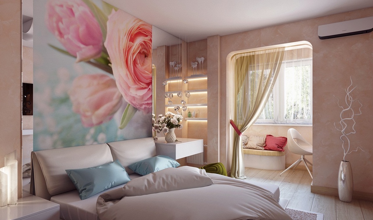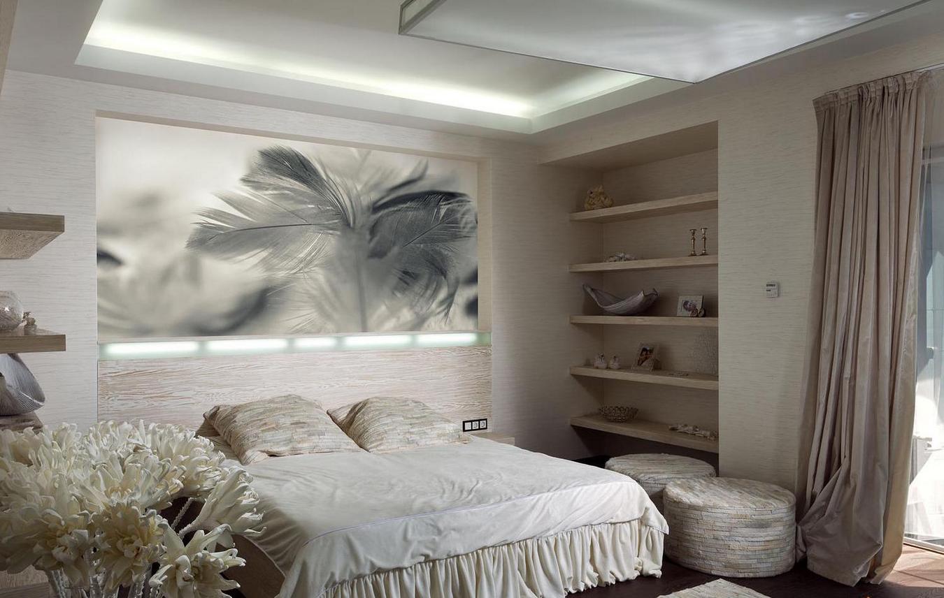 If the reverse does not imply the idea of the designer, photo wallpapers should be in harmony with the overall color scheme of the room. The interior in this case turns out to be softer, more tender, and conducive to rest, which is what is required from the bedroom.