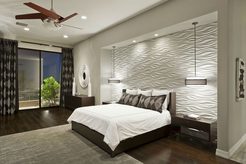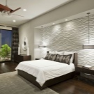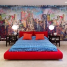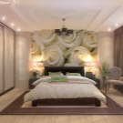 A modern-style bedroom with photo wallpaper is an option for lovers of modern solutions. Against the background of black and white, a bright color accent looks elegant.The relatively low cost of such an interior - the advantages of the image. Bed or sofa can be selected in any inexpensive collection of furniture. The depth of the room gives a combination of asymmetric lines of the pattern of wallpaper and the symmetry of the interior.