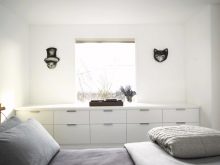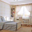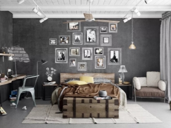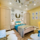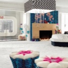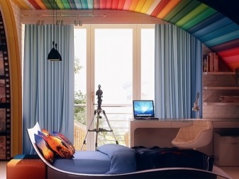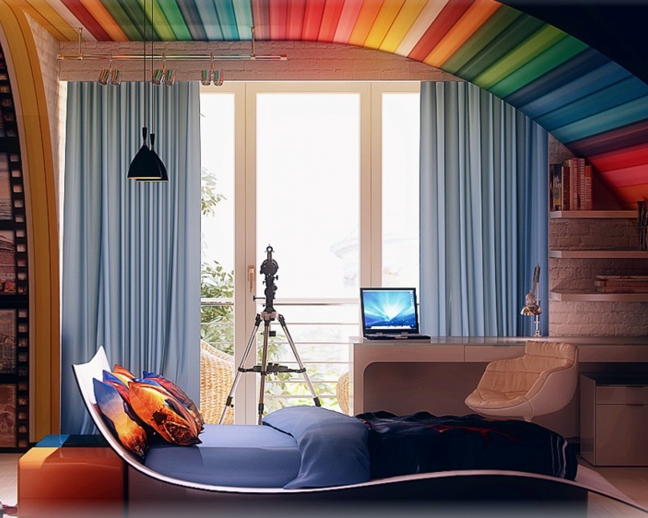 Creative blinds with a photo can create an image of a window. The room is easily transformed into a room for receiving guests, for example, for a pajama party, it is fun to watch movies on the big screen. Lamps should be in the style of high-tech, concise form with LEDs. The original interior, the main costs for the creation of which go to the purchase of furniture.