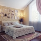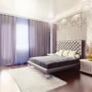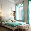 The walls are covered with embossed wallpaper, the interior consists of a wardrobe and bedside tables, the openwork framing of the cabinet is made using a wide curb. A huge soft bed can be ordered for only 20-25 thousand rubles. The highlight of the interior is the selection of textile elements according to color: the fabric of the curtains is in harmony with the material of the bedspread.