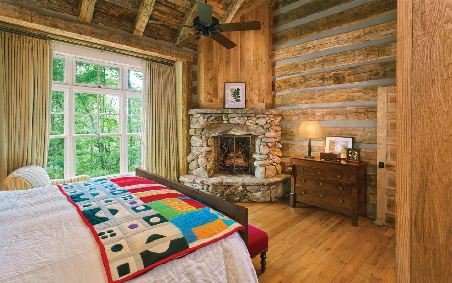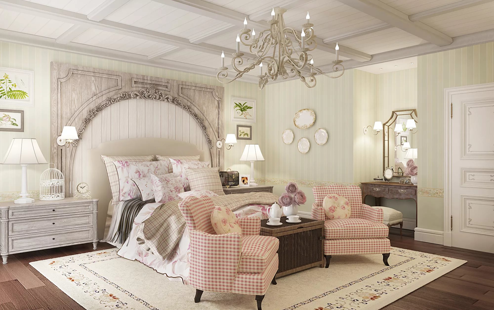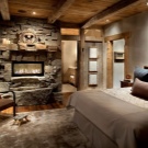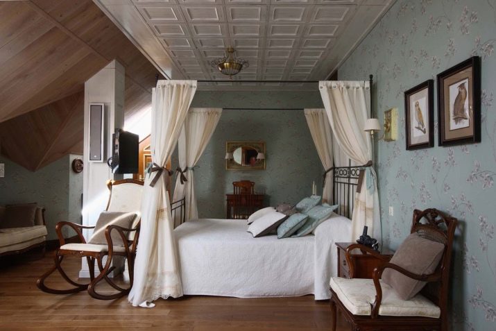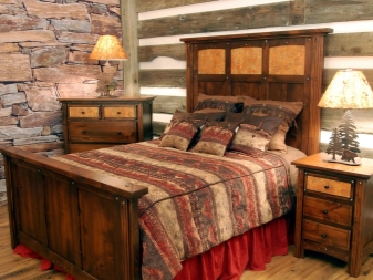 When building or buying a private house, it is easy to preserve the coziness of a rustic style.The bedroom for a married couple includes all the necessary elements of the situation for a comfortable rest. Here you can be together and not interfere with each other. One spouse can read a book on the couch, the other - to sleep. Without interfering with each other, you can sit in front of the TV in a rocking chair and on the bed.
