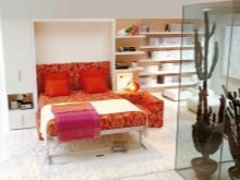 Remember that all corners of the cabin furniture should be rounded, which is very important in a small room. This version of the interior is a great choice for a bachelor, the lack of sunlight will allow you to go to bed at any time of the day and get enough sleep.