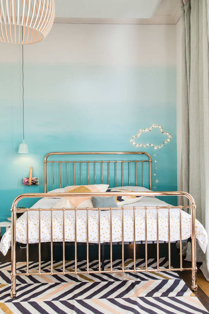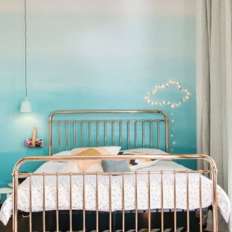 If the area of the room in the apartment is 6 square meters. m, then the ombre technique for painting walls will help to create a stylish look. A simple and elegant solution suitable for both teenagers and girls. The ombre effect helps to create a feeling of spaciousness, especially in blue tones. A simple bed with a metal headboard looks simple and elegant. Perfectly complements the interior, which would have to taste Amelie Poulen handmade air lamp.