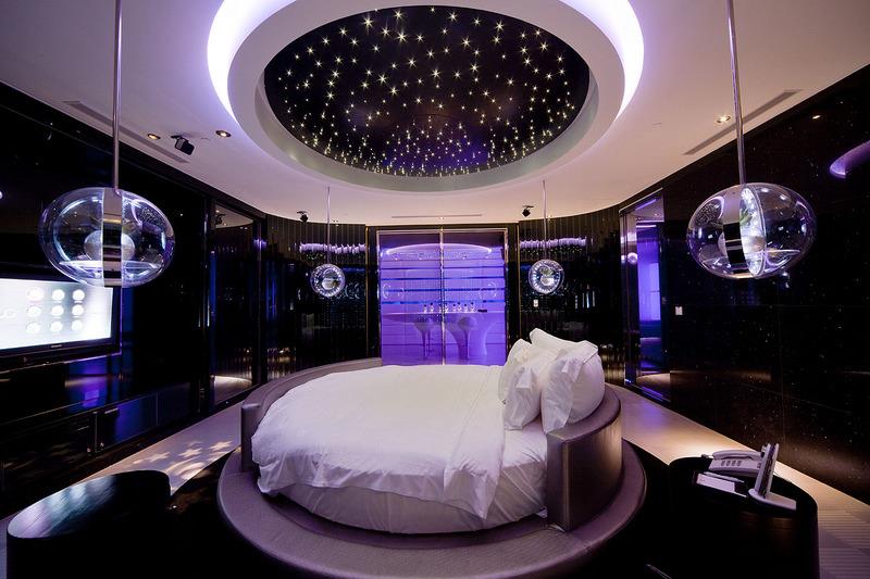 The starry sky is fascinating, especially when lying in a warm bed. Space interior solution is primarily a way to dive into the atmosphere. The color scheme is a combination of purple and dark pink, which is in harmony with the hues of distant galaxies. "Sky overhead" was created using ceiling wallpaper.