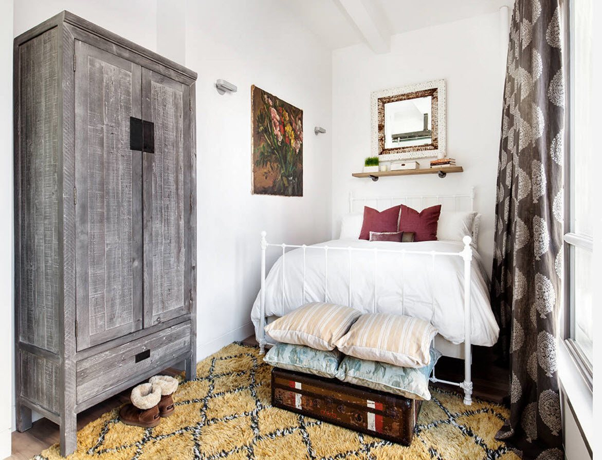 If the room is small, then carpet is suitable for flooring, heavy beds will not look here, modern sofas are the best option.