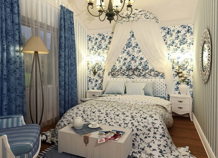The interior in the style of the French village gets its charm at the expense of textile elements. A pleasant feature of the design is that the Provence style can be sustained thanks to the combination of floral colors on a white background, small pads and a pile of tulle at the head. So, you do not need to engage in brickwork and choose a pattern on the forged headboard.