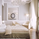 White - This is the most suitable, albeit a bold choice for a dark long bedroom. This room needs a visualization of space, with which this color copes well: it expands and gives more light to a dark room. When choosing this background, you need to remember about furniture. It is the furniture on a white background that will play the main role, because it must be bright and expressive.
