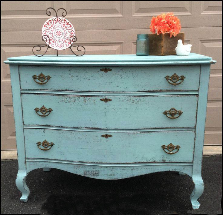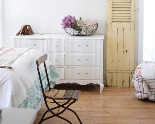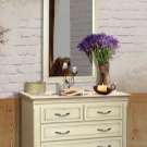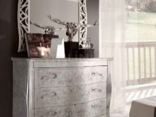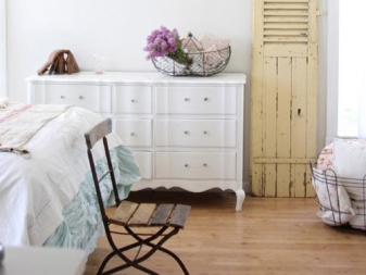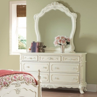 - Vintage and Provence - a dresser in such a bedroom should have a bright stylistic image. This version of the dresser should be light and elegant, with rounded corners and graceful legs.The decor elements here play a special role, especially hand-painted or decoupage is appreciated.