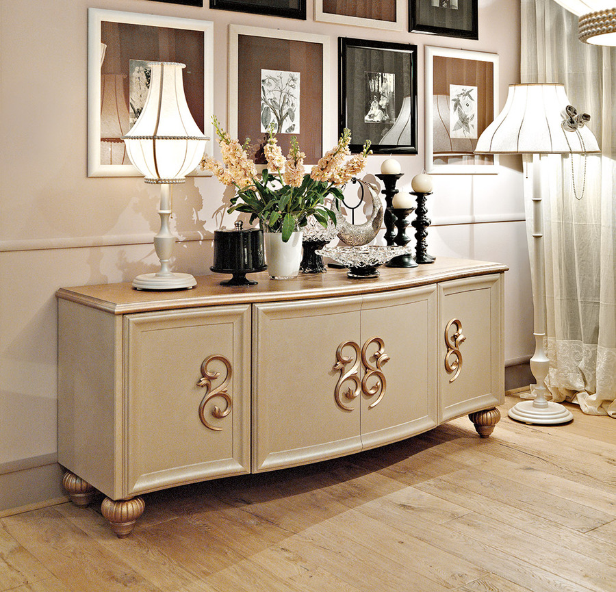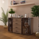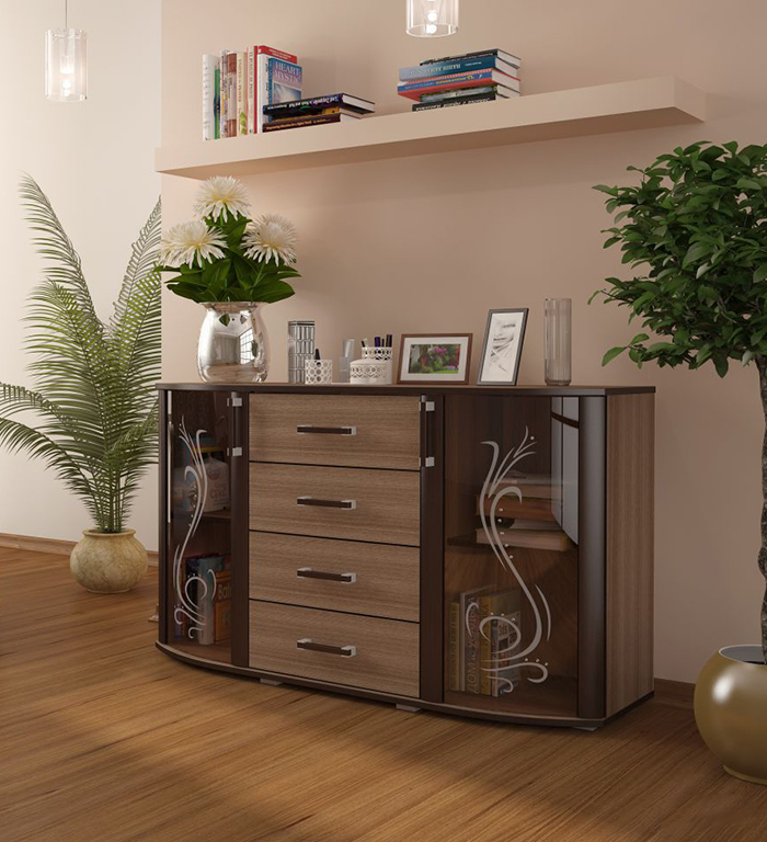 The variety of materials for modern dressers is surprising, but the classic and, not least, non-toxic material is wood.The decor of wooden furniture amazes imagination with intricate patterns and subtlety of carving. Some models can boast inlays on the facade and exquisite fittings. There are models made of solid wood in part, for example, only the front of the dresser, made of solid wood. This makes the price of the dresser lower.