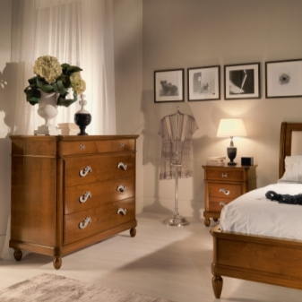 - Conservative - perfectly complements the bedroom in a classic style. Such a chest of drawers, as a rule, is large, with figured legs and with a wide table top, on which you can put pots with flowers and other interior decorations. Furniture in this style is usually made of natural wood.