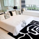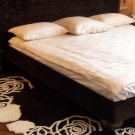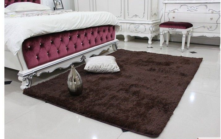 The reverse option - a noticeable carpet, contrasting. Its main task is to emphasize the color of furniture with opposite shades. For example, a black or chocolate carpet will visually whiten a white bed, and vice versa.