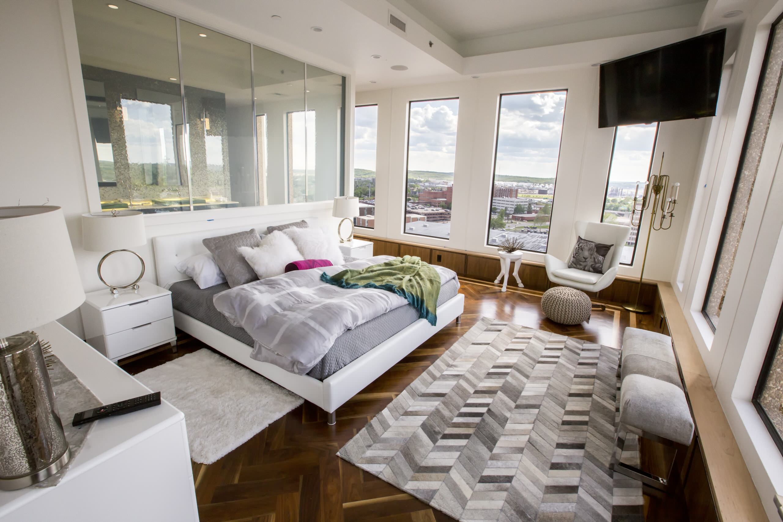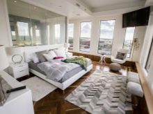 The soft pile of the carpet in the bedroom attracts attention, it is pleasant to walk on it barefoot, with proper care you can even sit on it.