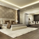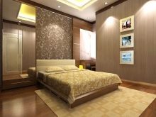 Recently, for the design of the bedroom is used such a style as modern. The main feature of this trend is that it has absorbed a small fraction of the traditional classics, but in a more restrained form. In this case, the main focus in the bedroom is on one wall.