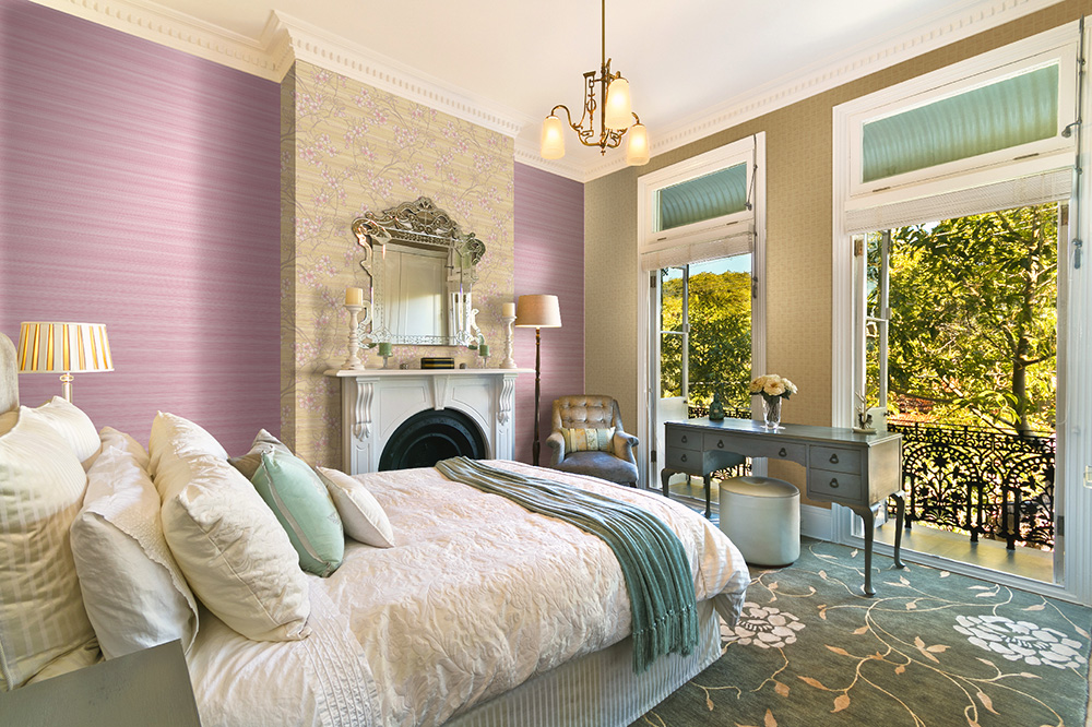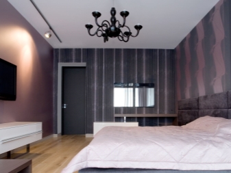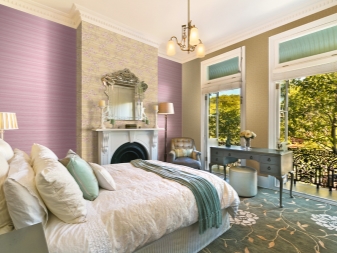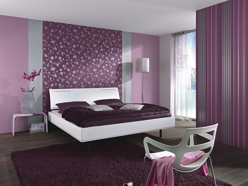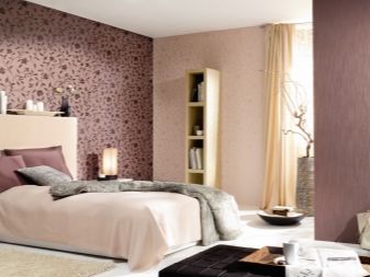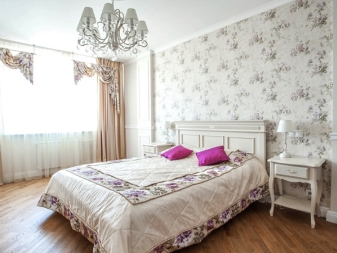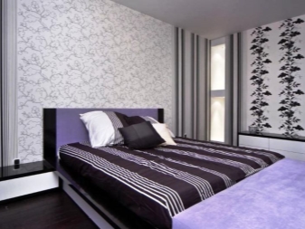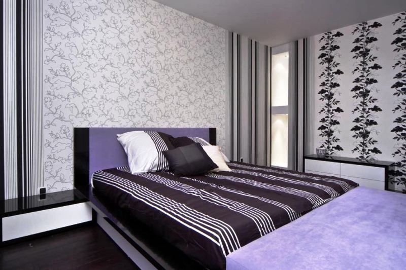 A good solution is to use patchwork combining.But such a design should be handled by a specialist, as simply sticking pieces in the chosen place will not work. Inserts should be in harmony with all components of the interior. For example, the purple color can be supplemented with a dark color insert with a small floral pattern. The bedroom in this design will look stylish and cozy.