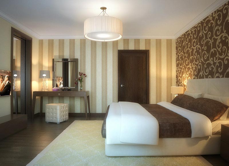In choosing wall coverings for the bedroom you need to pay attention to several important parameters. For a start, it is worth considering such a criterion as the height of the ceiling. From this directly depends on the texture of the wallpaper. For example, if the figures are less than 2.5 m, it is best to use pastel shades with a small pattern. This is due to the fact that in rooms with low ceilings, the light base helps to visually pull the bedroom up.