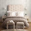 Choosing a bed with a high soft headboard, you pay tribute to comfort and practicality. The rest of the room furniture can be absolutely any. Well, if it is in tune with the furniture frame, then you’ll have a classic interior. The head of the bed can be an accent of the whole room, as in the photos.