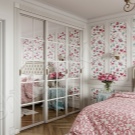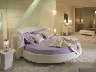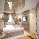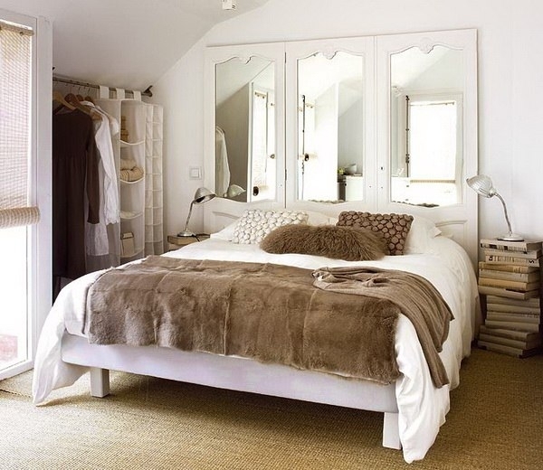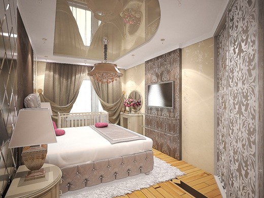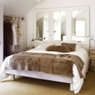 This women's bedroom - an abundance of textiles and mirrors, mirrors, mirrors. The mirror headboard will visually increase the area of the room, and fur textiles will add comfort to the room.