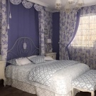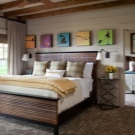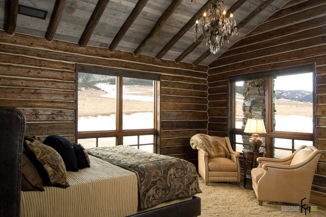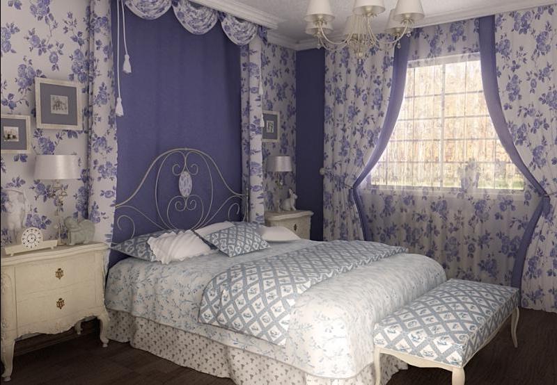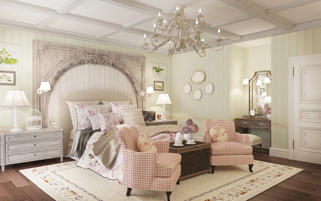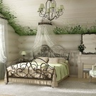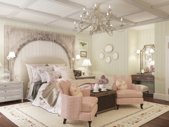 Rustic style in the interior of the bedroom involves the use of natural wood and fabrics. This may be a Provence with aged furniture and an abundance of light textiles - curtains, rug, a variety of pillows. Its feature is muted powdery shades: light blue, light pink, light yellow, lavender. Even for Provence characteristic floral print on curtains, walls (wallpaper), pillows and even furniture.