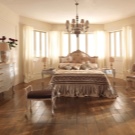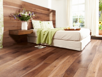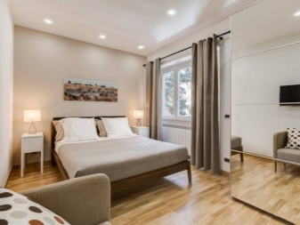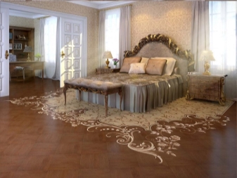 Parquet is a good choice for expensive interior. They can lay out an intricate pattern on the floor and give the bedroom even more originality. A wonderful “substitute” is a parquet board, affordable and not inferior to the first in status.