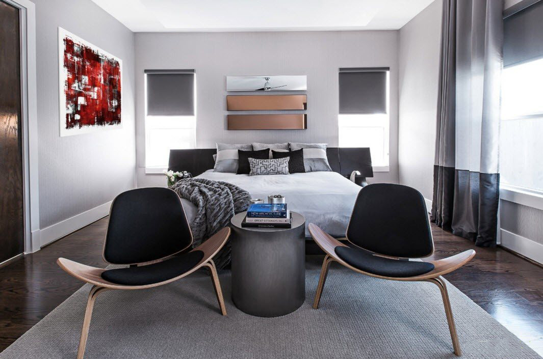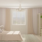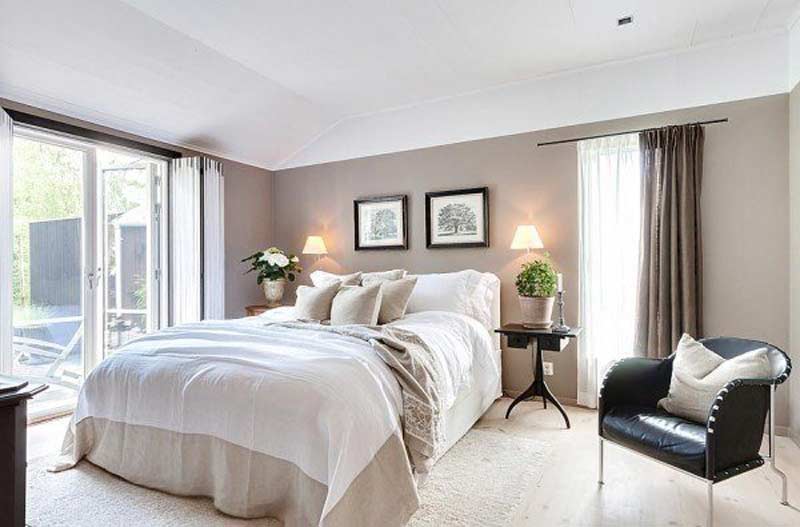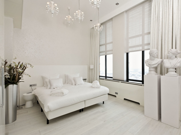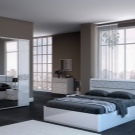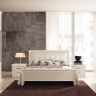 The bedroom interior in bright colors allows you to visually change the proportions of the room - to expand, lengthen and increase its space. “Cold” snow-white walls and dark flooring will make the room more spacious and visually lift the ceiling, make it wider than the wall. To finish the image of a light room, add a few dark accents - choose upholstered chairs or a sofa, bed frame or a whole set of furniture in tone to the floor (while the rest of the furniture and decoration should be light from snow white to beige and brown).