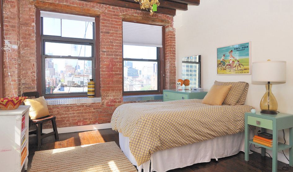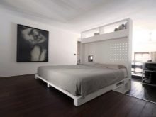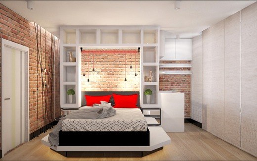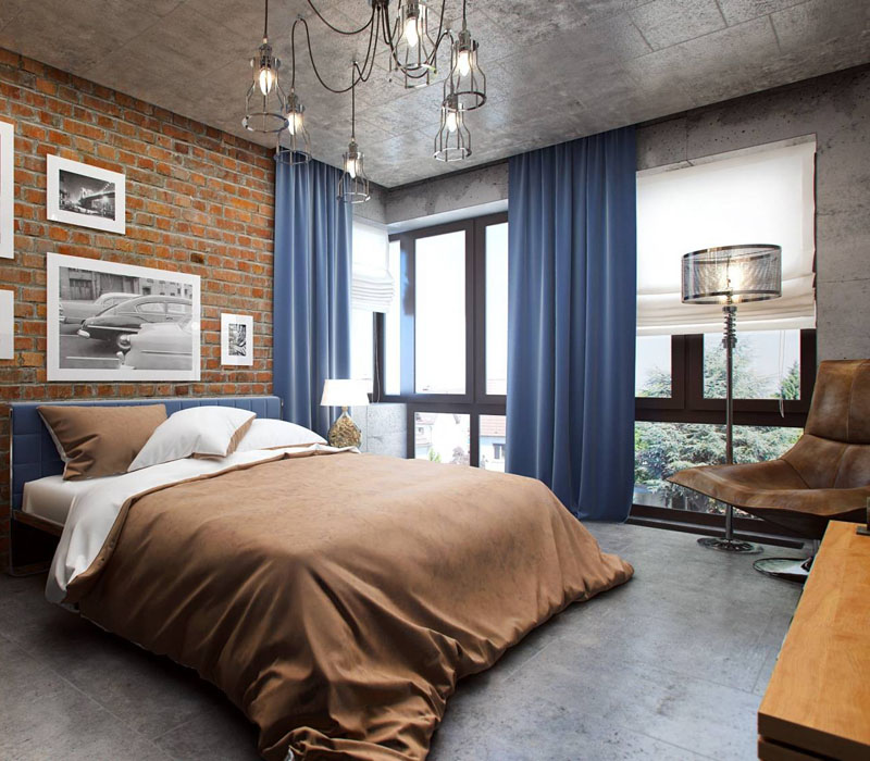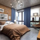 Loft style implies simplicity and chic in one bottle. His business card is a red brick wall (or any other “uncut”).Loft can be found on the ceiling beams and panoramic windows, high ceilings, which become an integral part of the interior. Loft resembles a warehouse or factory, workshop, workshop because of the "bare" walls. For the bedroom of a modern format, choose simple, but stylish furniture, better designer, and leave maximum space - do not clutter the space with regular chairs or side tables.