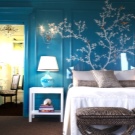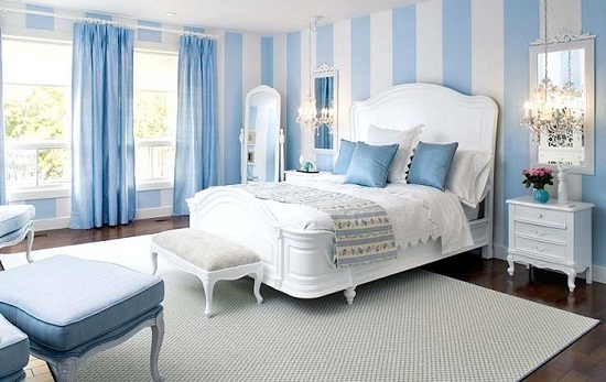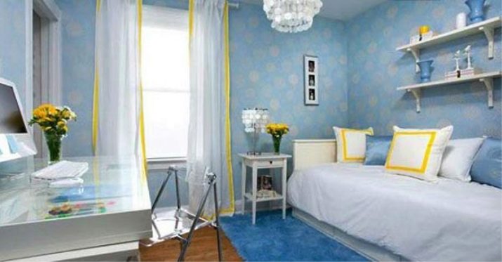 So, the blue walls are perfectly combined with the white floor and wooden pieces of furniture. Just do not paint the room in one tone, create an accent on one wall using patterns, and on the other use the main color. Zoning a room is not only an original, but also a practical approach to its design.