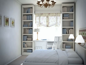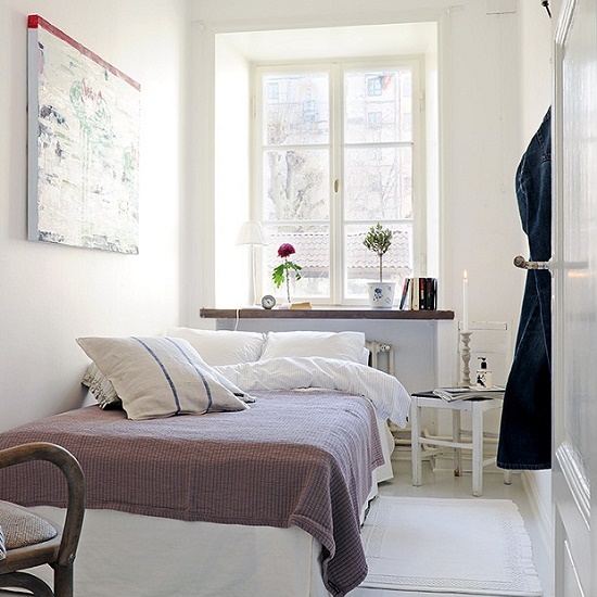 For a narrow bedroom, light (especially white) color is the right decision to expand the space. The bed can be installed both along the wall and in the middle of the room. It is more important to create a cozy home environment with textiles and lighting.