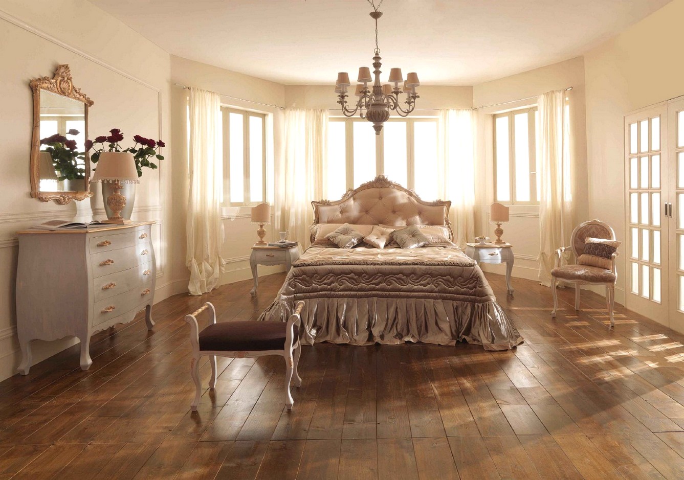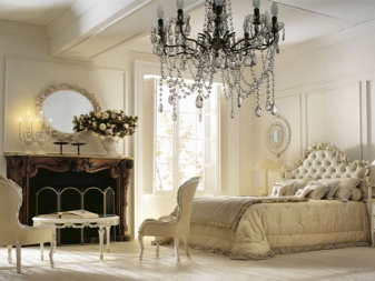 In the classic bedroom, the main focus is the bed. Usually it is part of a set of furniture of the same style and color - always wooden. In second place is the chandelier. Regardless of the size of the room, it must be this lighting fixture - crystal or metal, and a pair of floor lamps on the bedside tables.