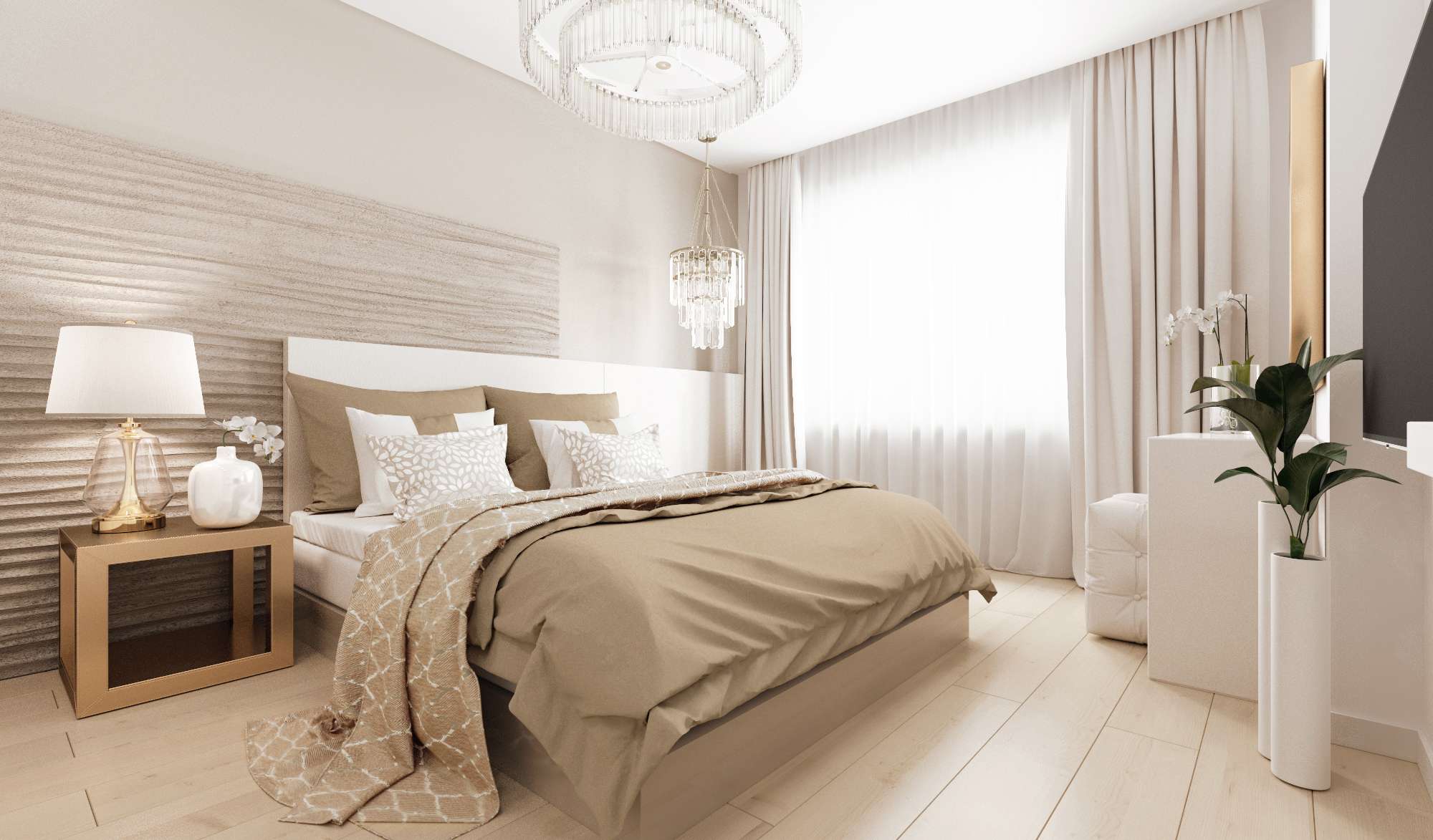 Beige walls are a good choice for a bedroom on the north or south side of the house. To create a cozy interior, designers recommend making wall cladding with wood or stone panels, and choose white or contrast furniture. In creating a beige bedroom, it is important to use several shades of this color - from milky to brown and to use wood - dark, light.