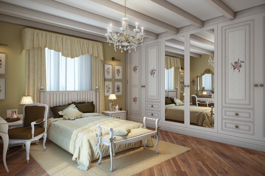The classic country style accepts wood and other “unpolished” natural materials - all the furniture in the bedroom can be wooden or diluted with ecological attributes (metal beds are welcome in Provence). It has a lot of beige and brown, which harmoniously intertwine with each other and create a contrast.