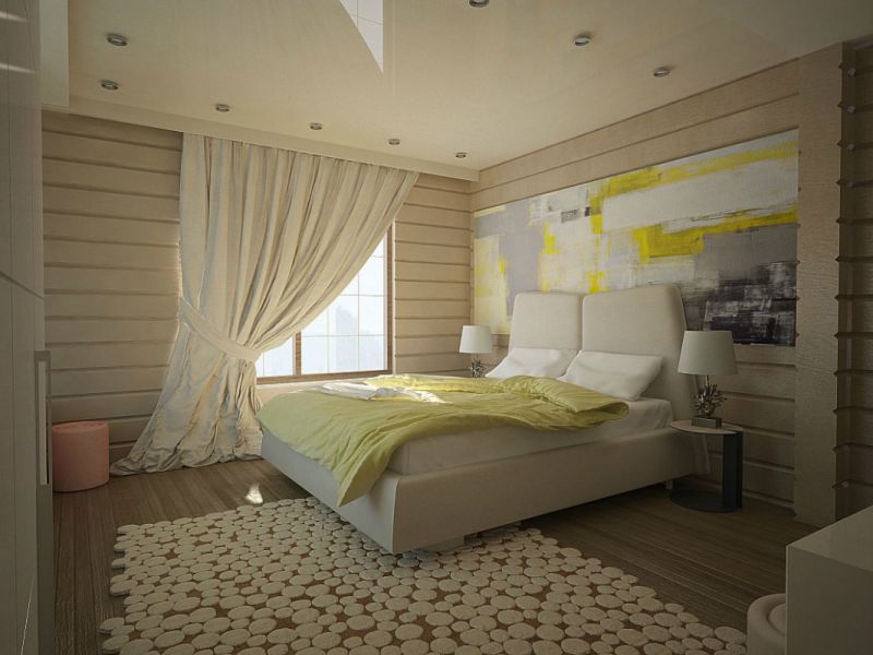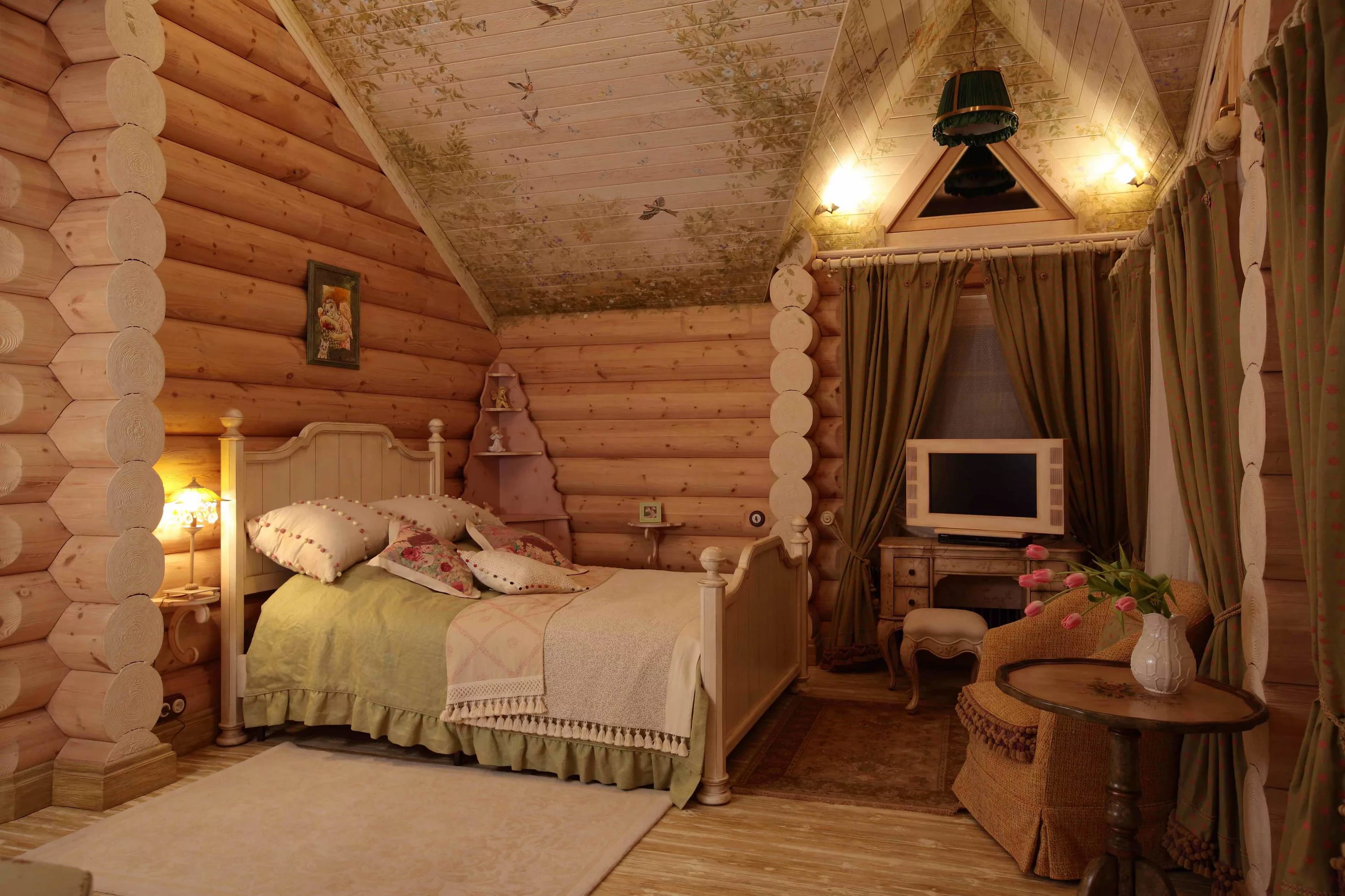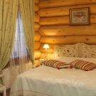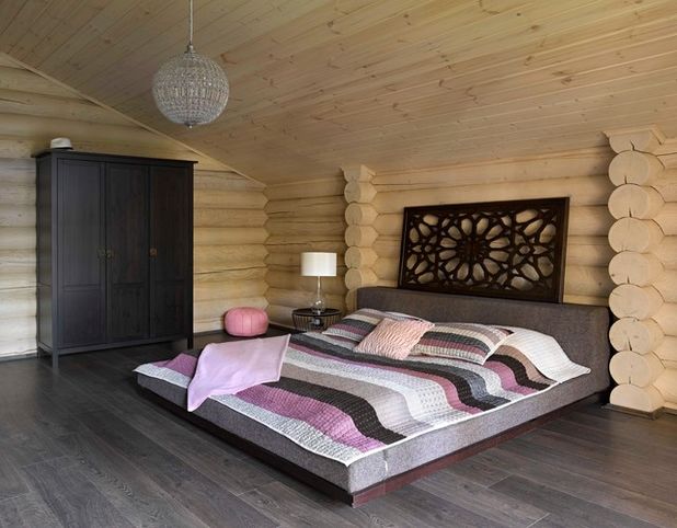 But if you are not a connoisseur of coarse beauty, then in a log house it is quite possible to equip and stylish modern bedroom. The walls of the bar will serve as an excellent background for a classic bed and light beige fabric coverings.Install modern technology and the room will change without losing its original charm.