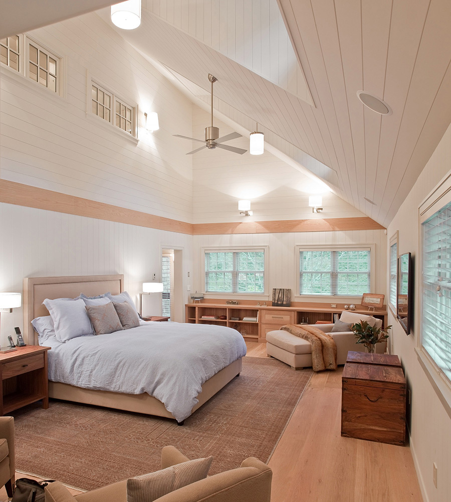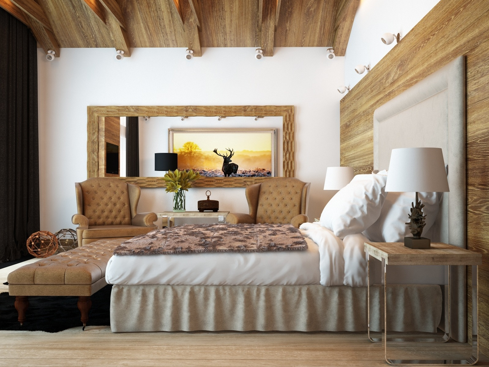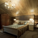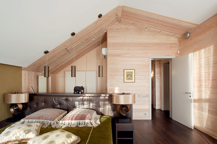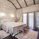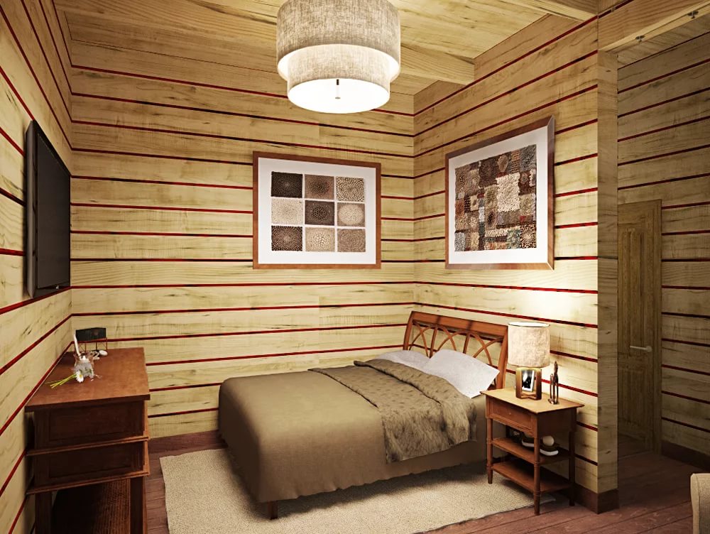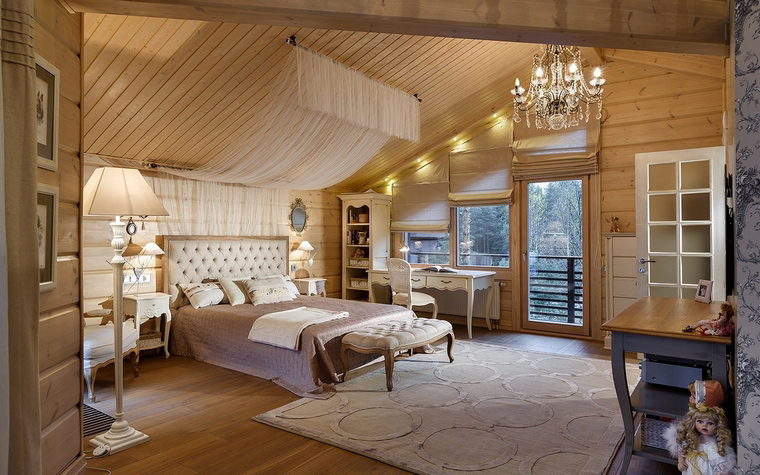 The bedroom in this style is ideal for the embodiment in a comfortable room for rest. Natural wood is breathable and promotes good sleep.
