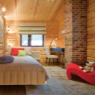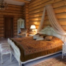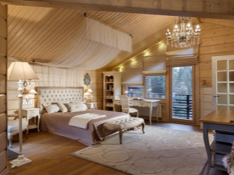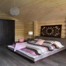 In a wooden house, you can create an interesting option for a cozy bedroom for the newlyweds or a mature couple. The central place in any sleeping room is occupied by a wide cozy bed. It is desirable that it fits in color to the interior. If the room itself is made of dark wood, then the bed should also be like that. You can decorate it in different ways. The easiest way is to cover it with a rug and lay out decorative pillows. You can also try to install a canopy. It can be either complete, covering the entire bed, or barely visible and translucent. In any case, such a decorative detail will only add a special zest to the room.