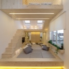 In such a room, you do not need to think about how to divide the room into several zones - everything has already been done for you.So, on the first floor you can install a sofa and a few cozy chairs with a table. Above you can place a working area, then - a bedroom. The seating area should be the most thoughtful.