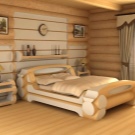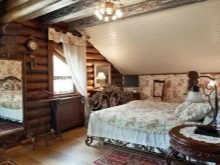 In a log house you can create stylish interior that resembles a room in a peasant hut. It uses simple furniture without any frills. An interesting option is a bed and a bedroom set, stylized under a tree. Here roughness, irregularities and other visible "flaws" are welcome. It looks interesting furniture, made, as if from gnarly branches. In such an interior would be appropriate to simple curtains, made from raw linen or fine light silk. You can also decorate furniture napkins or blankets handmade. If you can not knit or embroider, then you can try to sew a quilt. It looks quite bright, so it will decorate any room.
