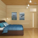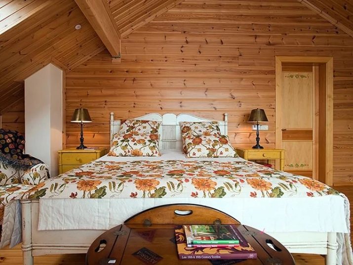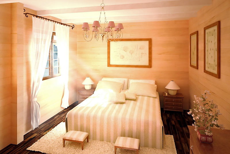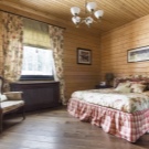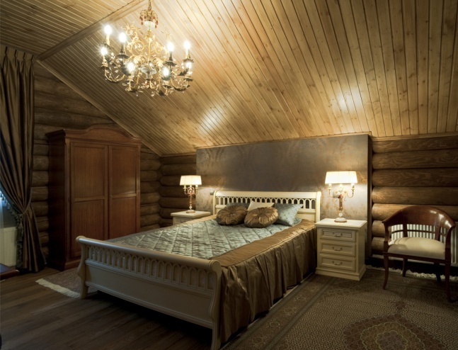 In a log house, special attention should be paid to lighting. In the bedroom you need to install artificial light sources. First of all, you need to take care of the overhead light. In addition, you can install various floor lamps, wall lamps or simple table lamps.