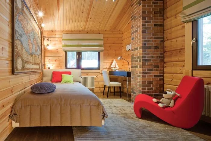 So that the large room does not seem too empty and uncomfortable, supplement it with all sorts of details. With wooden walls, simple and concise decorations will be best combined. Pictures in wooden frames, unusual figurines and fresh flowers are the easiest and most affordable way to diversify your room.