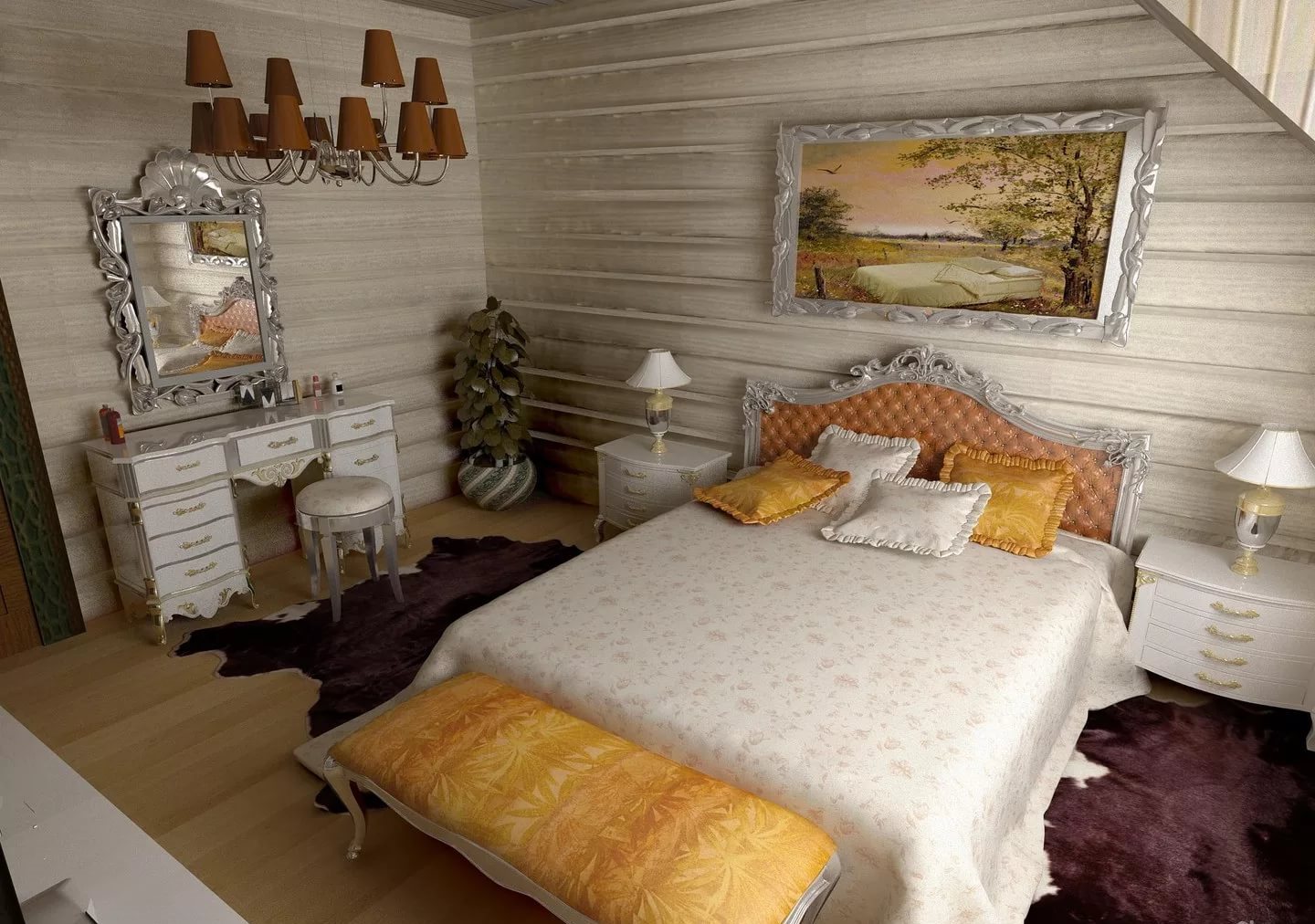 You can also try to arrange such a bedroom. in traditional stylee.Classic decorative elements are perfectly combined with wood and metal. So, for example, in such a bedroom, a bed with curved forged legs will look good.
